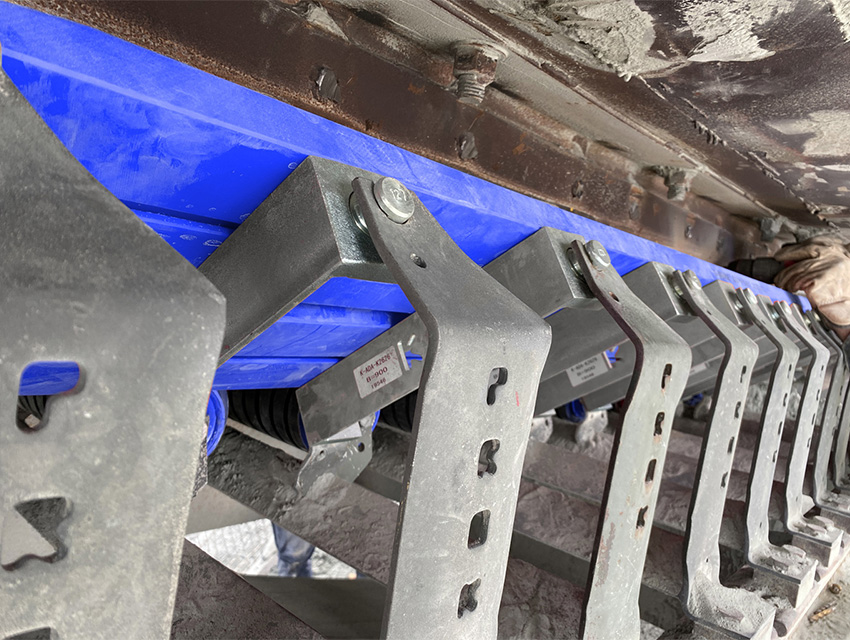 缓冲床安装在物料落料点,可有效吸收物料下落产生的冲击力,防止损伤输送带及输送带机架,同时两侧缓冲条和输送带托辊可以调节至一致角度,防止物料从输送带边缘洒落。